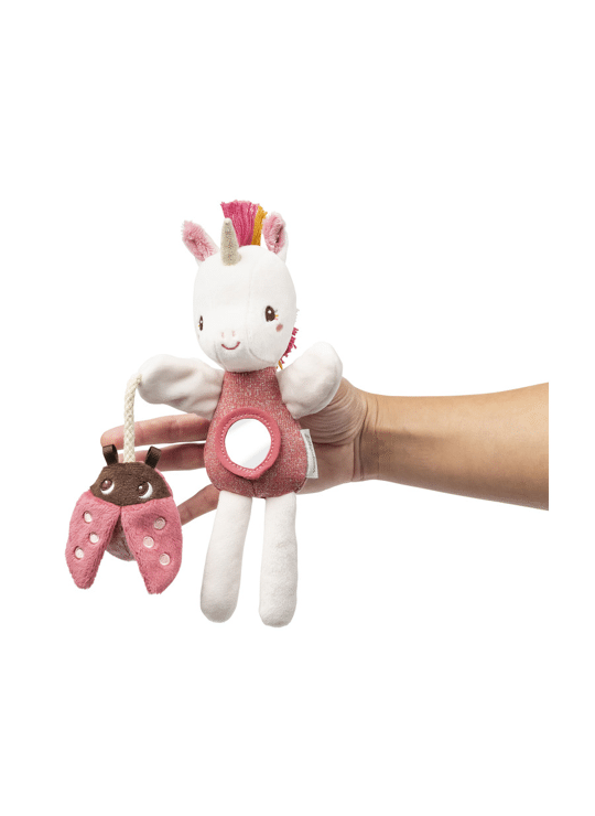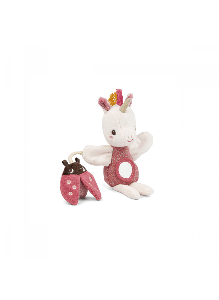 Familie-uitjes zijn magischer met de pop Lena de eenhoorn! Deze kleine vingerpop is ideaal voor het vermaken van baby's vanaf 6 maanden. Met zijn praktische formaat van 16 x 7 x 23 cm past hij in uw zak of tas en komt hij op magische wijze tot leven tot grote vreugde van de kleintjes! Om dit te doen, haal je je vingers door de 2 armen van de pop en ga je op weg naar de show. Je kunt deze pluche poppen ook gebruiken om de liedjes, kinderliedjes en andere verhalen van je kind tot leven te brengen. Maar dat is niet alles! Deze Lilliputiens-pop biedt 3 activiteiten om de zintuigen van uw kleintje te vermaken en te stimuleren. Eerst een rammelaar ter hoogte van Lena's hoofd, die vrolijk rinkelt als je haar laat bewegen. Dan zorgt een ronde spiegel op hun buik ervoor dat je kleintje zichzelf keer op keer kan bewonderen. Natuurlijk het beste voor het laatst: het kleine lieveheersbeestje, Lena's beste vriendin, knettert dankzij ritselpapier. Deze pluche pop is daarom een ideaal speelgoed om het zicht en gehoor van de baby te stimuleren, maar ook zijn motoriek en fantasie. We houden van de glinsterende effecten van onze fantastische eenhoorn, zijn mooie hoorn en zijn manen vol kleuren! Je kunt dit speelgoed voor jonge kinderen in de machine wassen op 30°.