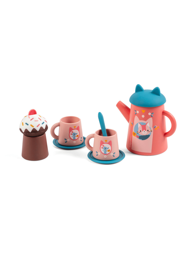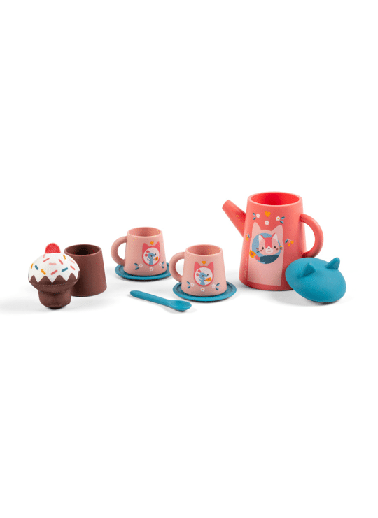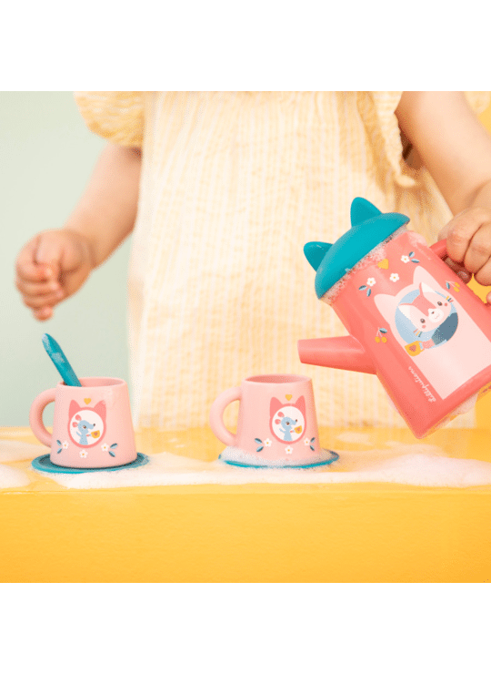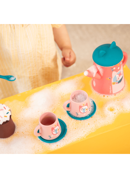 Klaar voor een spetterende snack? Hier is een origineel badspeeltje: een theeservies, ontworpen voor kinderen vanaf 18 maanden. Deze theepot en de bijbehorende accessoires zijn ideaal om in en uit het water te spelen en doen denken aan een speelkeukentje. Ze zijn perfect om de fantasie van volwassenen te imiteren! Deze theeset bestaat uit 9 delen en bestaat uit: een theepot met de afbeelding van kat Jeanne en een siliconen deksel met kleine kattenoren, twee kopjes met muisjes erop, twee schoteltjes, een klein lepeltje en een tweedelige muffinvorm voor eenvoudig onderhoud. Wij gieten, wij morsen, wij schenken... Welke andere plek is daarvoor beter geschikt dan de badkamer? Misschien weet u het al, maar onze Jeanne houdt ervan om thee te drinken met haar vriendinnen. Het is tijd voor haar om te ontspannen, een beetje zoals badtijd! Dit fantasiespeelgoed is geschikt voor zowel water- als keukenplezier. Met zijn gastronomische accessoires nodigt hij uit tot gezelligheid op elk moment van de dag! Een hapje eten met oma? Een grote plons in het bad? Een gietbeurt om af te koelen op een warme dag? Het zijn de kinderen die beslissen! Ontworpen om gemakkelijk te drogen: spoel de set eenvoudigweg af met schoon water en laat alle onderdelen drogen tot het volgende gebruik. “Het is theetijd!”