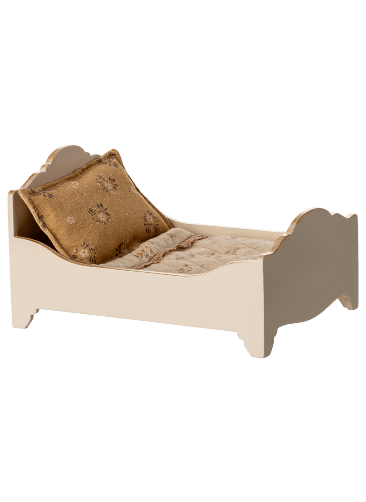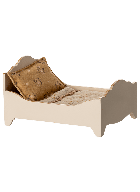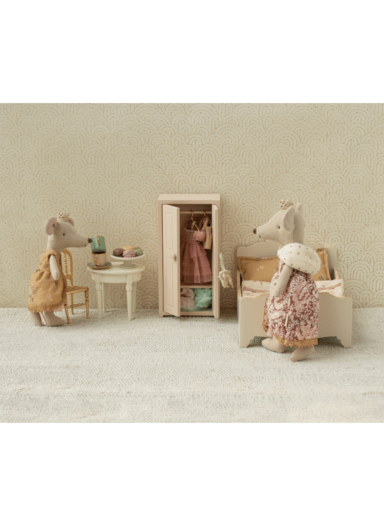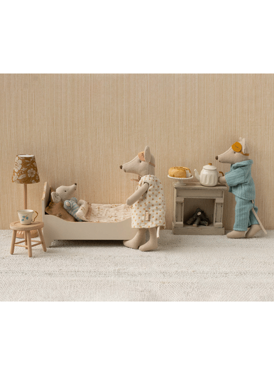 The perfect bed for a good nights sleep. This bed has beautiful small details such as golden finish on the wood and beautiful collected fabrics for bedlinen. Two mice can easily sleep side by side as it fits big sister/brother mice.