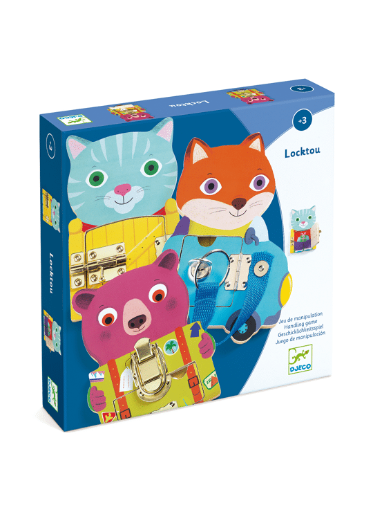 Een spel voor de motoriek met drie schattige houten diertjes waarbij het kind oefent met het openen en sluiten van sloten op elk van hen. Vanaf de leeftijd van 3 jaar begeleidt Locktou de eerste leerprocessen.