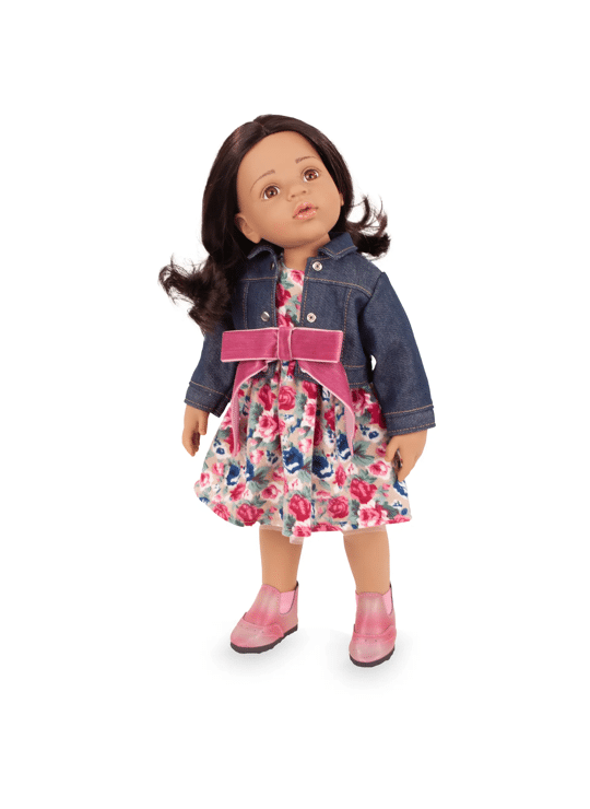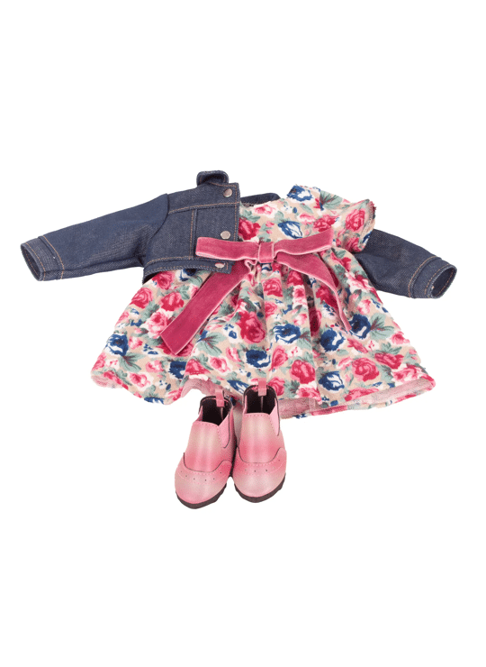 Give your standing doll a striking appearance: a classic denim jacket combined with an elegant dress featuring a rose pattern and shimmering boots. Premium fabrics, precise craftsmanship, and a harmonious design make this ensemble a stylish choice. Rely on quality that convinces – and on fashion that unites elegance and character.