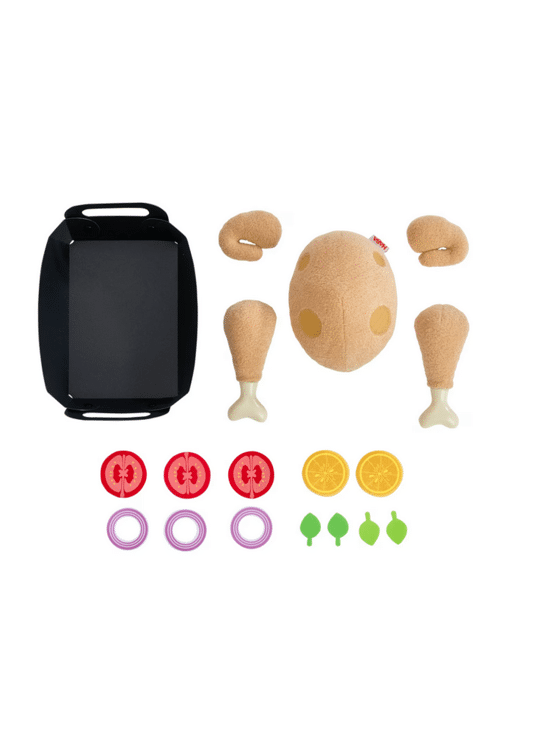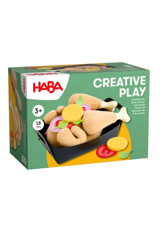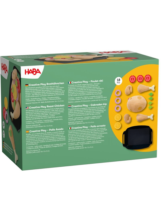 Laat de culinaire fantasie van kinderen tot leven komen met deze zachte, realistische Brathähnchen van HABA! Het setje bestaat uit een stoffen gebraden kip, braadslee en allerlei accessoires zoals tomatenschijfjes, uienringen, basilicum en citroen. Dankzij de klittenbanddelen kunnen kinderen de onderdelen losmaken en opnieuw samenstellen, wat de fijne motoriek, hand-oogcoördinatie en creatief rollenspel stimuleert.