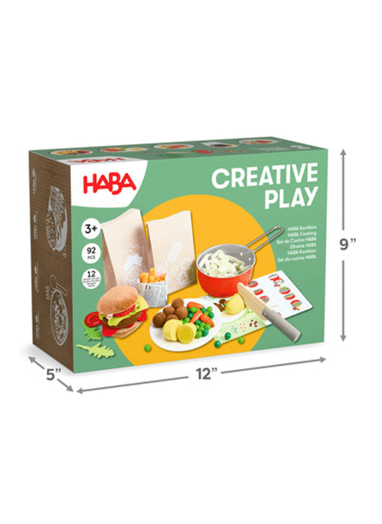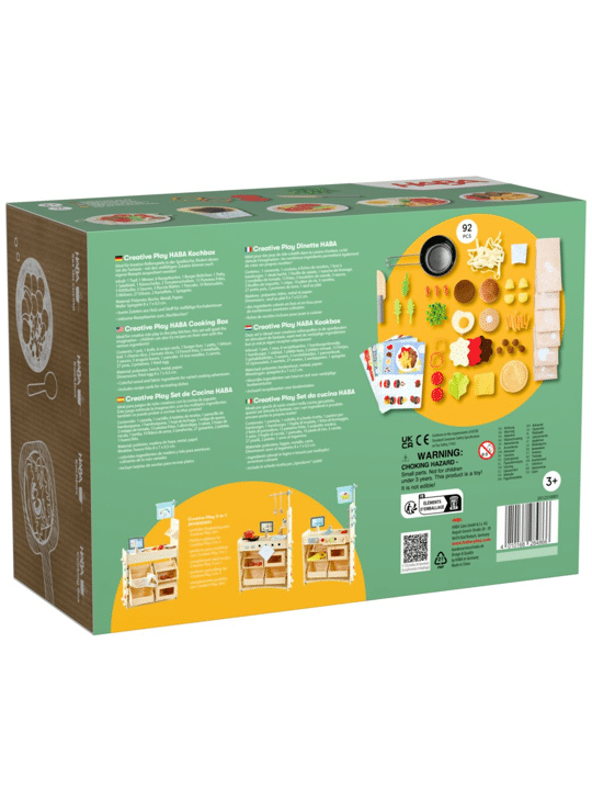 Laat jonge chefs hun culinaire talent ontdekken met de HABA Creative Play – Kookbox! Deze uitgebreide speelset voor kinderen vanaf 3 jaar bevat meer dan 90 houten en stoffen ingrediënten, waaronder hamburgers, wraps, ramen en groenten, samen met visuele receptkaarten die stap voor stap uitleggen hoe maaltijden worden bereid. Zo stimuleert de set creatief rollenspel, fijne motoriek, cognitieve vaardigheden en sociale interactie.