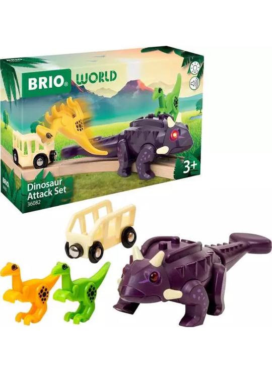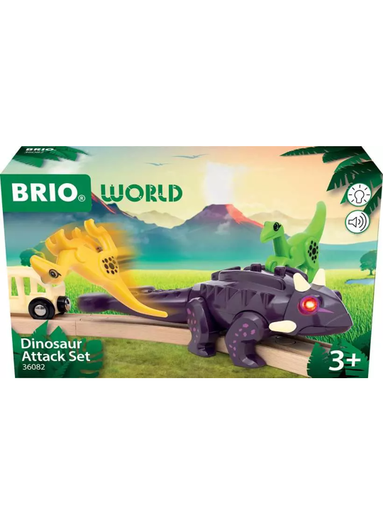 Ruim elke hindernis uit de weg met de 36082 Dinosaur Attack Set. Deze machtige dino past perfect op de houten rails van BRIO. Hij komt tot leven met rood oplichtende ogen en brult zodra hij zich beweegt. Met zijn zwiepende staart zet de Ankylosaurus de twee kleurrijke velociraptors uit deze set met gemak opzij! De magneet in z'n staart zorgt ervoor dat hij wagons kan trekken, net als een BRIO locomotief. Onderdeel van de BRIO World Dinosaur-serie, voor kinderen die dol zijn op dino's en treinen.