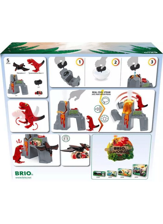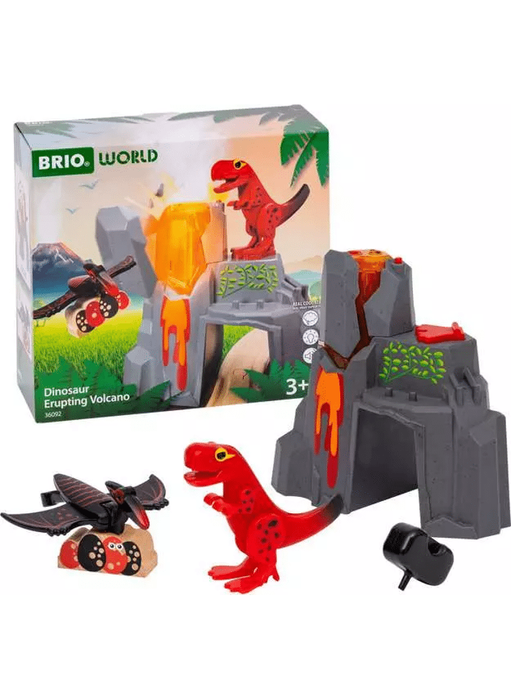 Gerommel en gedonder! De 36092 Dinosaurussen met vulkaan staat op uitbarsten. Speel spannende prehistorische avonturen met deze speelset rond de dinowereld. Neem de figuren op in je zelf ontworpen BRIO World! Laat de vulkaan uitbarsten met de kleine knop op de top. De lavalichten gaan gloeien, de vulkaan komt tot leven en er komen veilige stoomeffecten uit de krater. Daarna barst de vulkaan uit en de T-Rex op de top kijkt trots neer op z’n rijk.