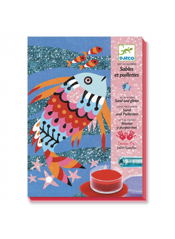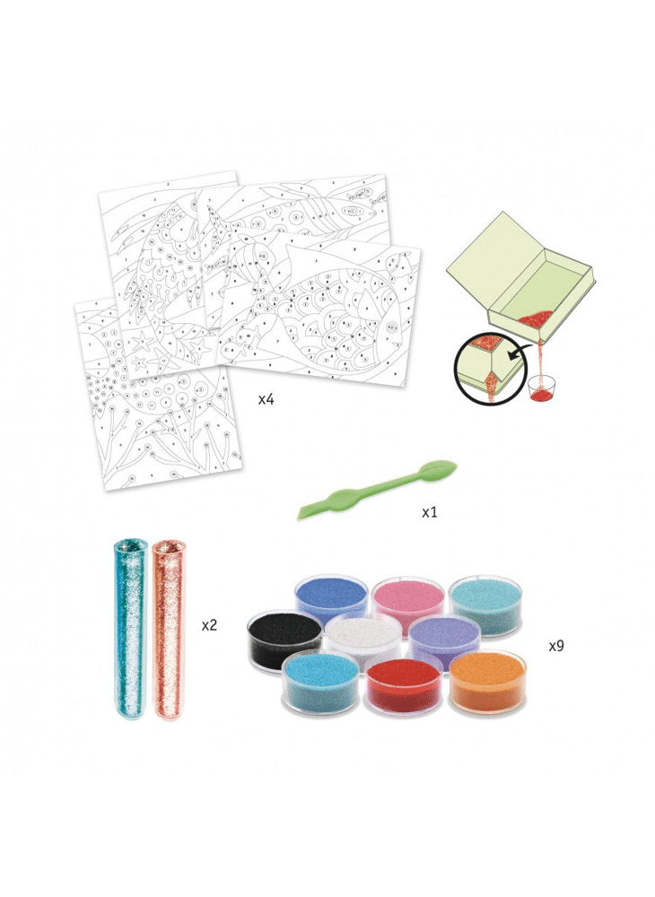 4 tekeningen met vissen als thema, om te doen oplichten met gekleurd zand en glitter. De kinderen leggen hun tekening in de doos, maken de voorgelijmde vlakken open met het meegeleverde gereedschap en bestrooien ze vervolgens met gekleurd zand en glitterpoeder volgens de kleurcode in het boekje. Als de activiteit voorbij is, verschijnen de kleuren van de plaatjes en schitteren de vissen!