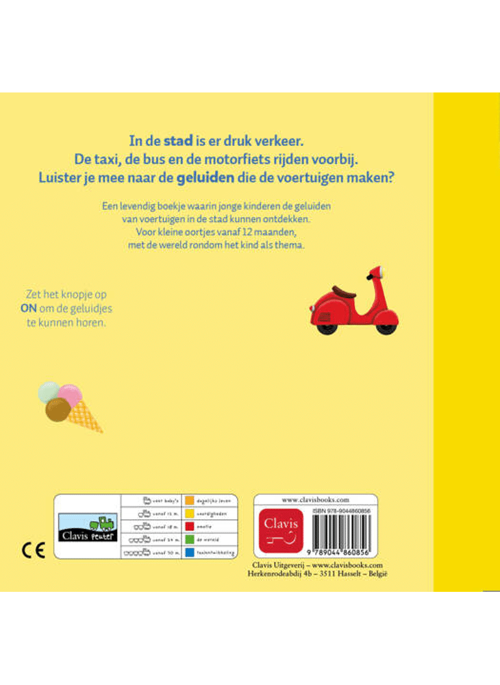 In de stad is er druk verkeer. De taxi, de bus en de motorfiets rijden voorbij. Luister je mee naar de geluiden die de voertuigen maken? Een levendig boekje waarin jonge kinderen de geluiden van voertuigen in de stad kunnen ontdekken. Voor kleine oortjes vanaf 12 maanden, met de wereld rondom het kind als thema.