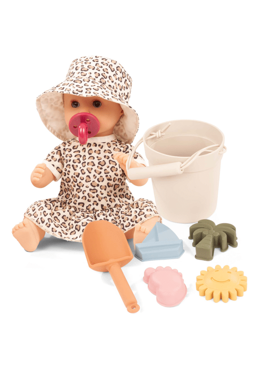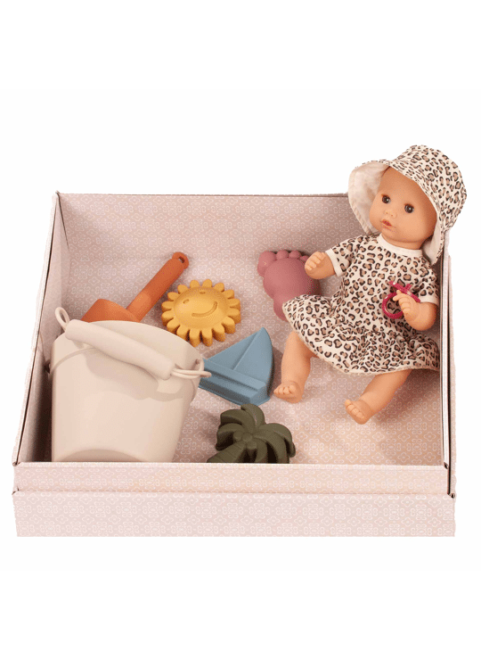 A beautiful gift set with an elegant gift box. The adorable bathing doll Sleepy Aquini girl with sleeping eyes wears a cool summer dress and bucket hat and brings along high-quality sand toys: a toy bucket, a shovel and four sand moulds made from silicone. This set is perfectly wrapped and ready to be handed over as beautiful gift. Perfect for creative play fun on the beach or in the sand box. An absolute highlight for little adventurers!