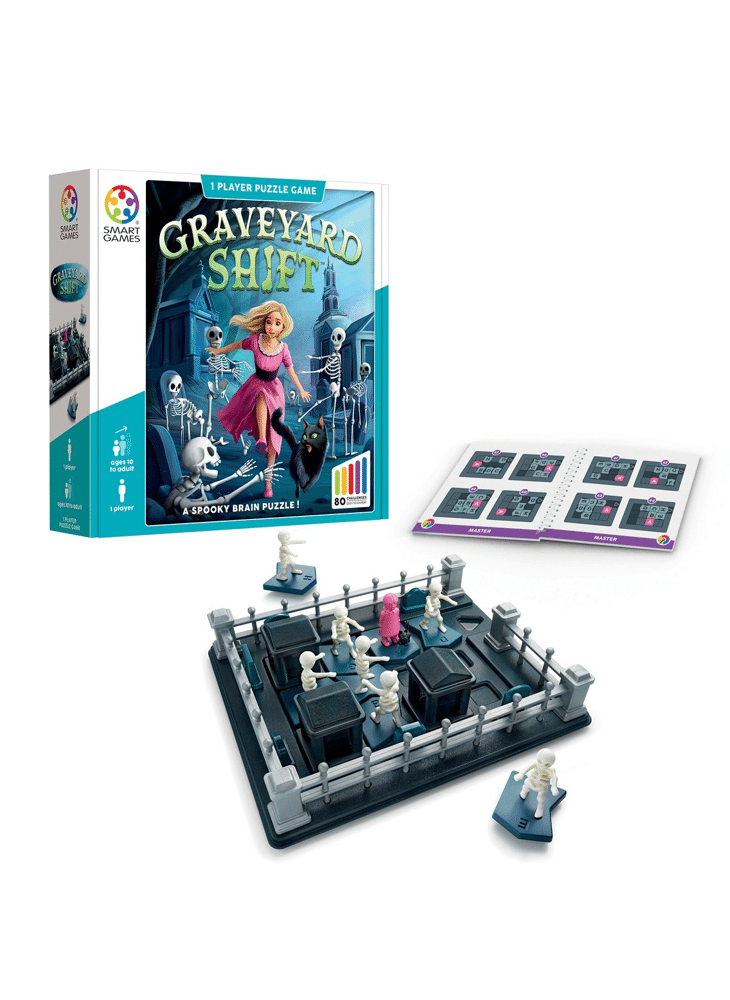 In de doos: speelbord, puzzelstukken van grafsteen en skeletten, puzzelstuk met meisje en kat, en opdrachtenboekje met oplossingen.