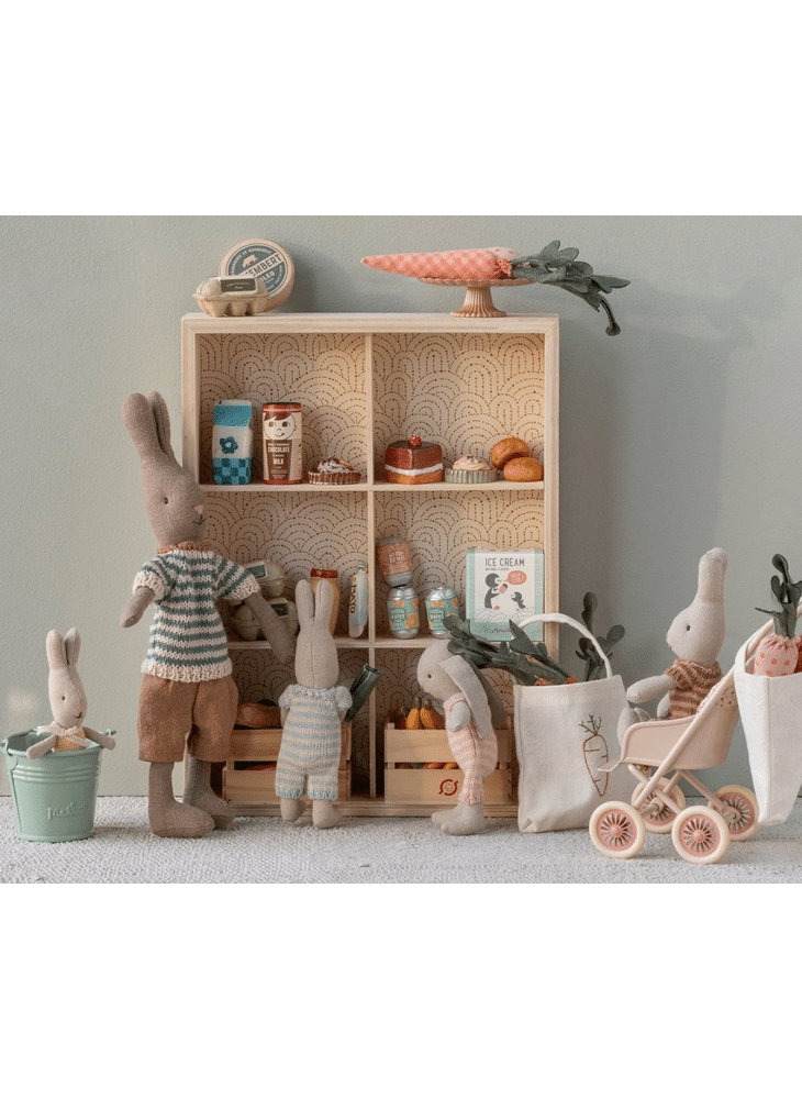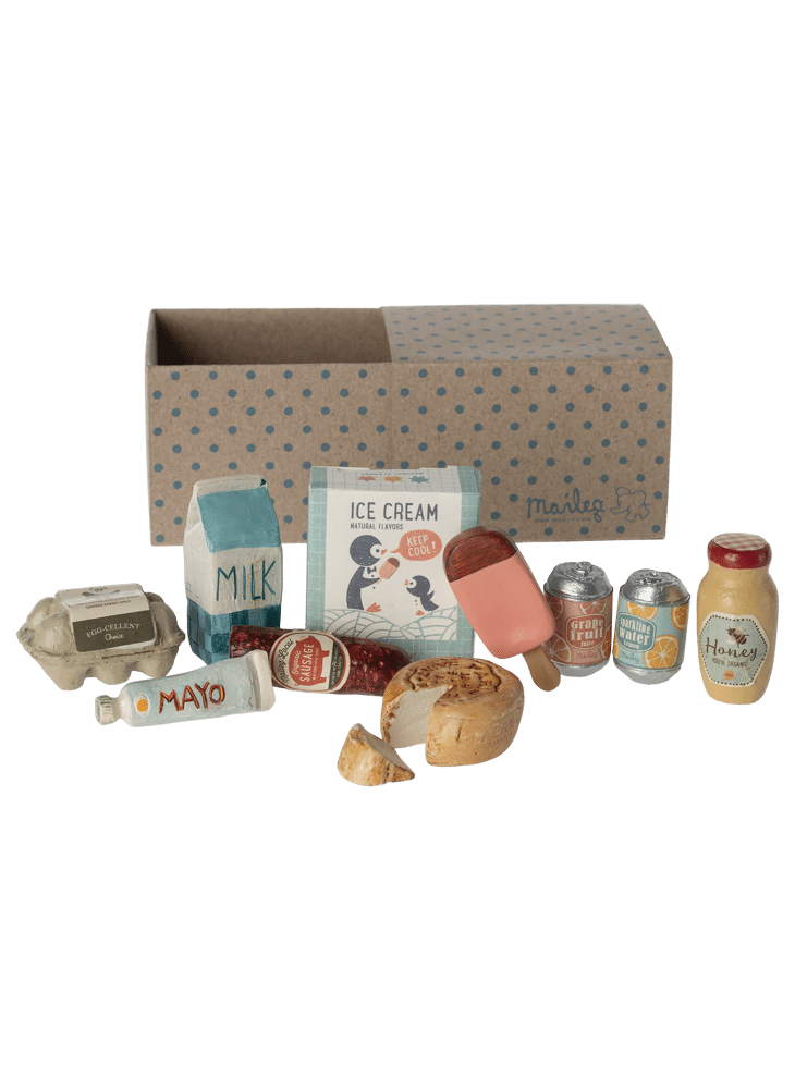 All the food your Maileg friend needs. This selection of food includes mayo, milk, honey jar, sausage, 4 ice cream sticks, egg cartons, 2 soda cans and cheese. It comes in a cardboard box. Small variations may occur in the painting.