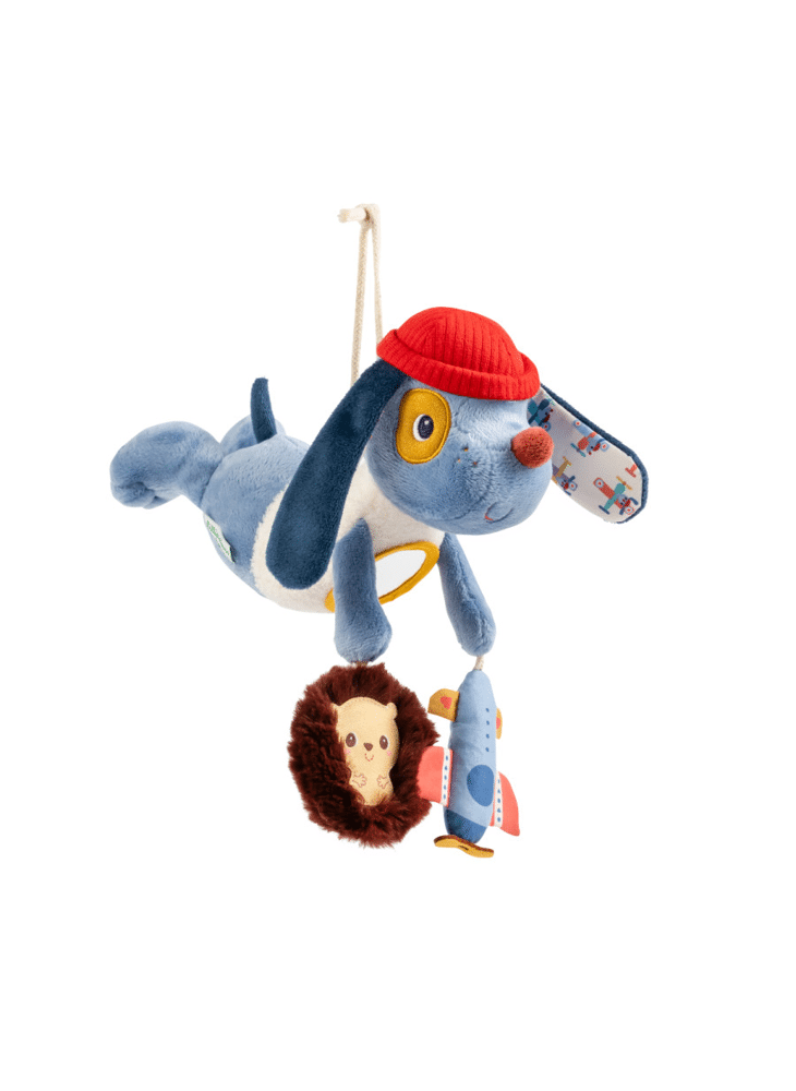 Jules houdt toezicht op de baby en vermaakt hem! Deze hangende knuffelhond is ideaal om je kleintje bezig te houden in de auto, de kinderwagen, etc. Je kunt Jules zelfs aan de activiteitenboog hangen voor een leuke speeltijd! Dit draagbare speeltje is geschikt vanaf 3 maanden en heeft iets intrigerends voor je baby. Dankzij het ronde spiegeltje op Jules’ buikje kan hij zichzelf herkennen en observeren, en hij kan plezier hebben met het grijpen van de kleine educatieve speeltjes die Jules hem op een vriendelijke manier aanbiedt: zijn vliegtuigje bevat ritselend papier, dat hij steeds opnieuw moet laten kraken; en het schattige egeltje heeft een rammelbal in de vorm van een bal die leuk is om te schudden, maar ook om naar te kijken, en die ook nog eens prachtige kleuren heeft! Dat zijn drie activiteiten voor een compleet en superleuk hangspeeltje! Met dit schattige knuffelhondje kan je baby spelen met geluiden, texturen, reflecties... Zijn zintuigen worden geprikkeld in het gezelschap van ons kleine pilotenhondje. Dit activiteitenspeeltje is eenvoudig op te hangen en weer los te maken, dankzij het koord. Hierdoor kan het ook gebruikt worden als knuffelbaar hondje. Een must-have voor uitstapjes met uw baby: dankzij de bewegingen van de kinderwagen of auto beweegt het blauwe knuffeldier heen en weer en komt het tot leven, waardoor de interesse van uw kind steeds weer wordt gewekt. Jules is een klein hondje dat zijn vriendjes graag helpt: hij draagt een vest met een zachte textuur, dat prettig aanvoelt maar ook heel praktisch is wanneer hij zijn vliegtuig hoog in de lucht bestuurt. De vliegtuigpatronen die in zijn oren zijn geprint, herinneren hem aan zijn passie voor de luchtvaart. En zijn rode hoedje! Zo schattig! Met zijn formaat van 22 x 24 cm kunt u dit speelgoed voor de eerste leeftijd cadeau doen als kraamcadeautje, altijd klaar voor een wandeling in de buitenlucht. Neem Jules van Lilliputiens overal mee naartoe!
