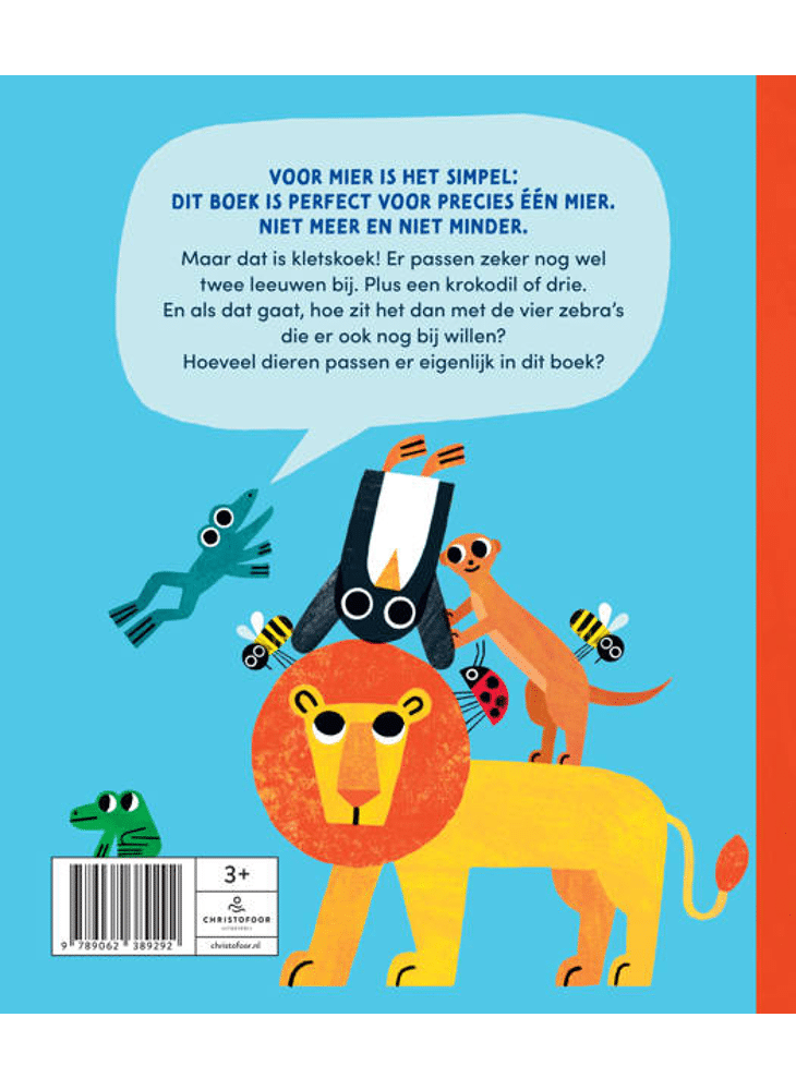 Voor mier is het simpel: Dit boek is perfect voor precies één mier. Niet meer en niet minder. Maar dat is kletskoek! Er passen zeker nog wel twee leeuwen bij. Plus een krokodil of drie. En als dat gaat, hoe zit het dan met de vier zebra’s die er ook nog bij willen? Hoeveel dieren passen er eigenlijk in dit boek? In dit boek ontmoet je een eigenwijze mier die vindt dat er maar één dier in het boek past. Maar wat gebeurt er als andere dieren zich ook willen laten zien? Met vrolijke illustraties en een humoristische twist is dit boek een feest voor nieuwsgierige kleintjes.