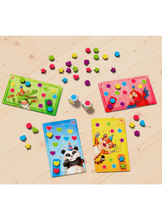 De eerste speler die de kleurrijke confetti helemaal rond het eigen dier heeft gestrooid, wint het spel.