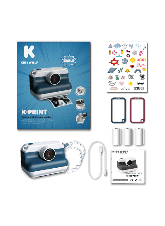 K-PRINT is een instantcamera die is ontworpen voor kinderen vanaf 8 jaar. Dankzij thermisch printen (op papier of stickers) print hij razendsnel, zonder inkt of cartridges. Een strak design, leuke filters en stickers inbegrepen: alles is aanwezig om je mooiste herinneringen vast te leggen, te personaliseren en in stijl te delen.