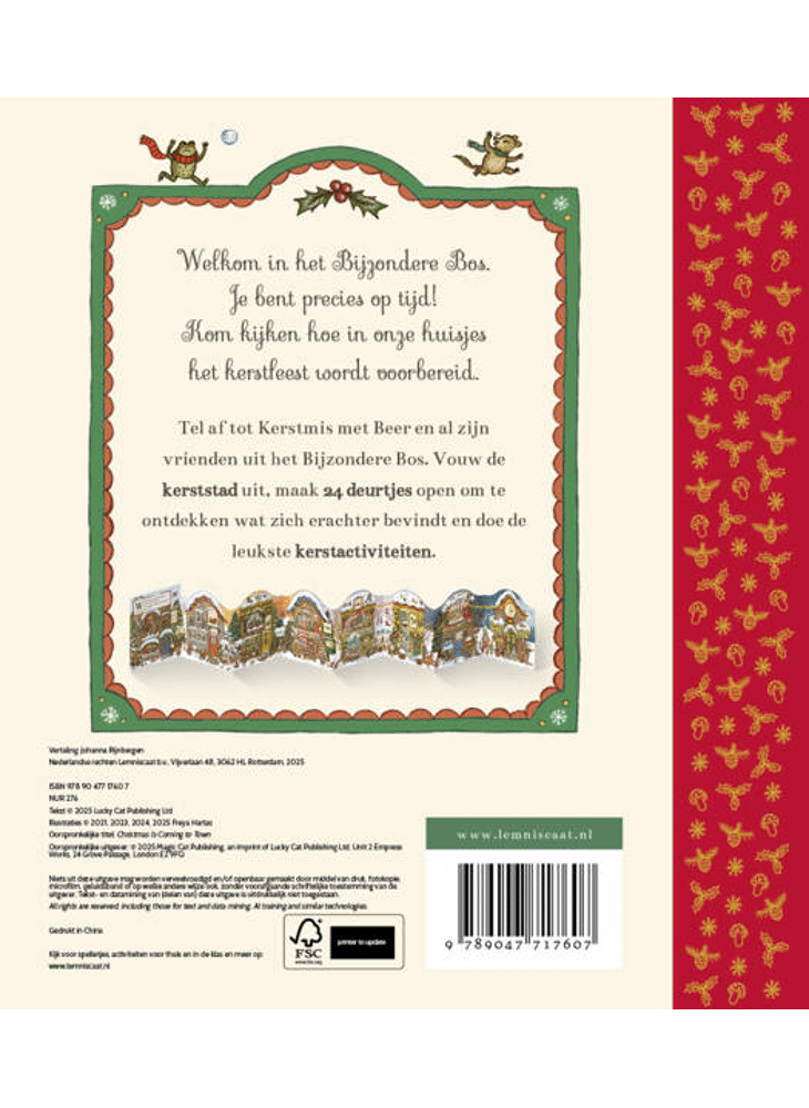 Het onmisbare boek voor de decembermaand!Vouw de stad in het Bijzondere Bos van Beer helemaal uit en zet hem op een mooi plekje in de kamer. Maak iedere dag een vakje open en onthul niet alleen de vrolijkste tekeningetjes, maar ook een vrolijk gedicht dat je vertelt wat je allemaal in aanloop naar kerst kunt doen om helemaal in de stemming te komen.Draai de schitterende leporello en ontdek nog meer leuks: een recept voor wortelhaverrepen voor het rendier (en voor jou), hoe je een peperkoekenholletje voor Konijn versiert (en ervan smult), hoe je een sneeuwhert maakt, hoe je een brief aan de Kerstman schrijft en hoe je kerstverhalen vertelt.Zet dit boek in je kamer en je bent meteen in de kerstsfeer!
