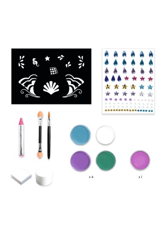 4 kleuren schmink 1 metallic oogschaduw 1 potlood 1 penseel 2 sponsjes 1 applicator met dubbel uiteinde 1 vel sjablonen voor op de huid Circa 40 zelfklevende parels en strassteentjes voor op de huid 1 instructieboekje met stap-voor-stap instructies om 3 modellen te maken