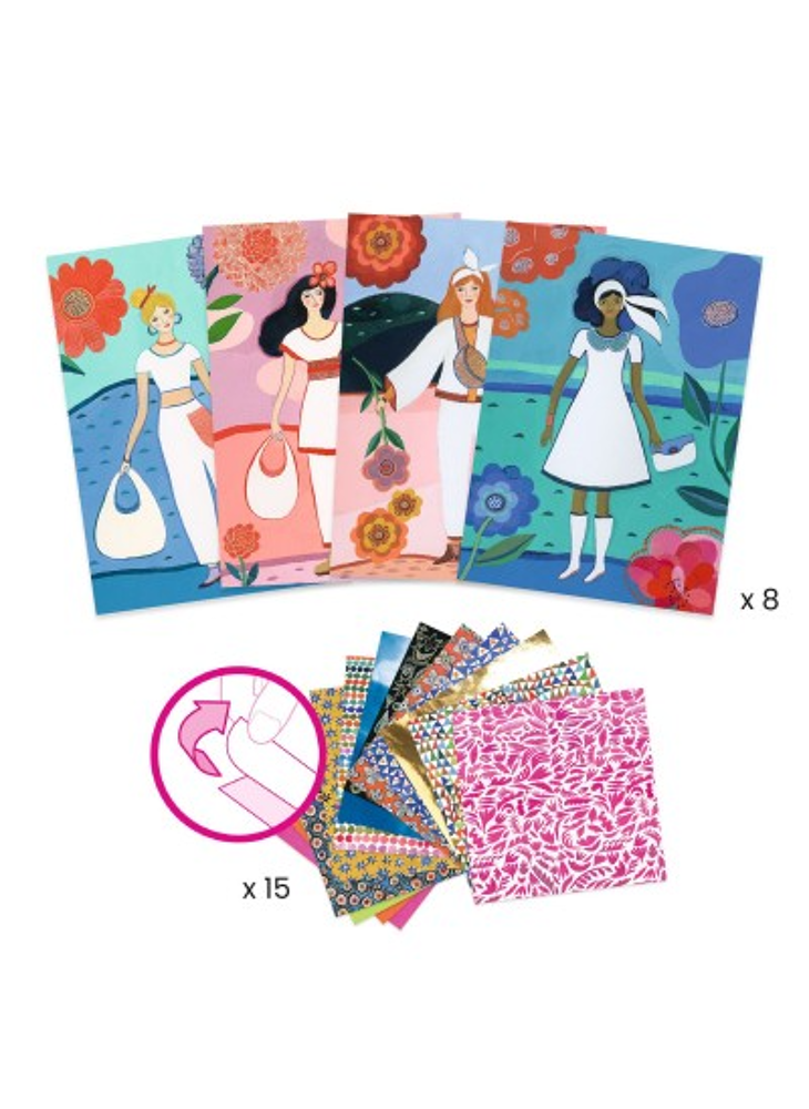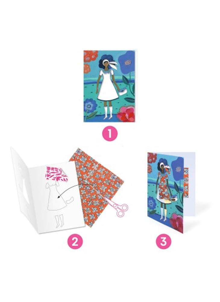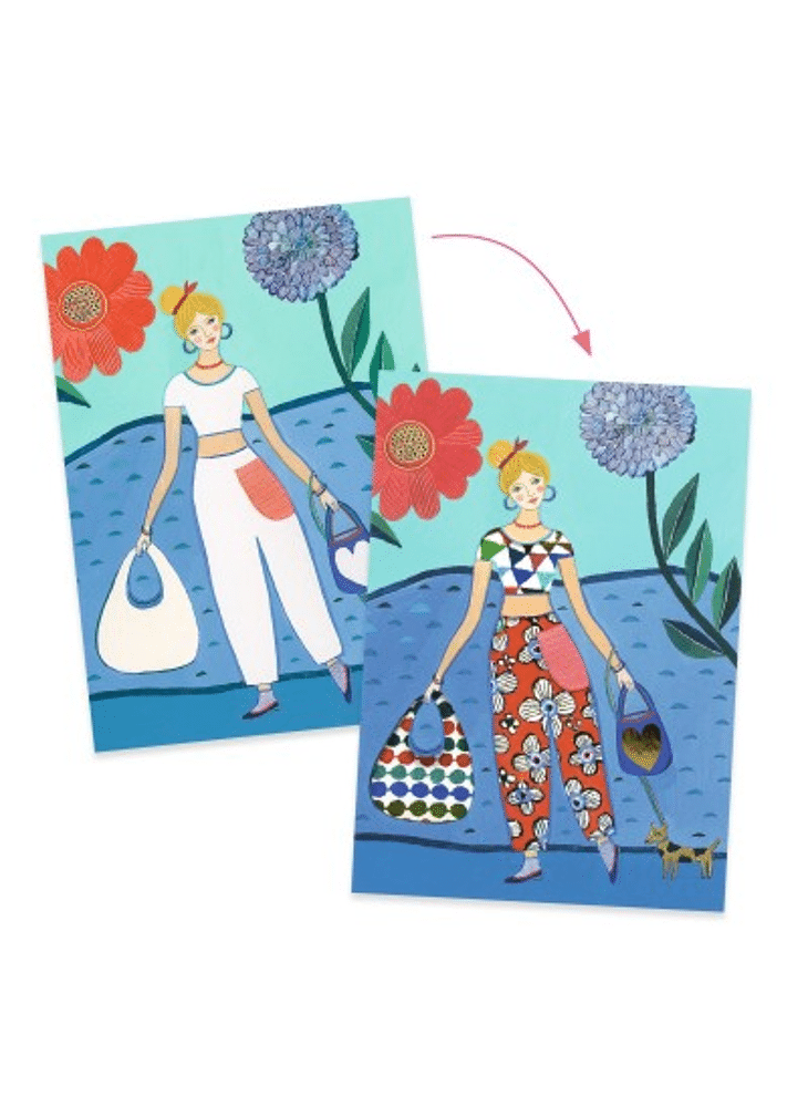 Tover 8 originele kaarten om tot unieke modecreaties! Met de zelfklevende vellen met verschillende motieven (fluorescerend, metallic en nog veel meer) kunnen kinderen 4 modellen aankleden waarbij ze hun fantasie de vrije loop laten. Als je de kaart dichtklapt, begint de magie: het figuurtje verschijnt subliem in zijn eigen wereld!