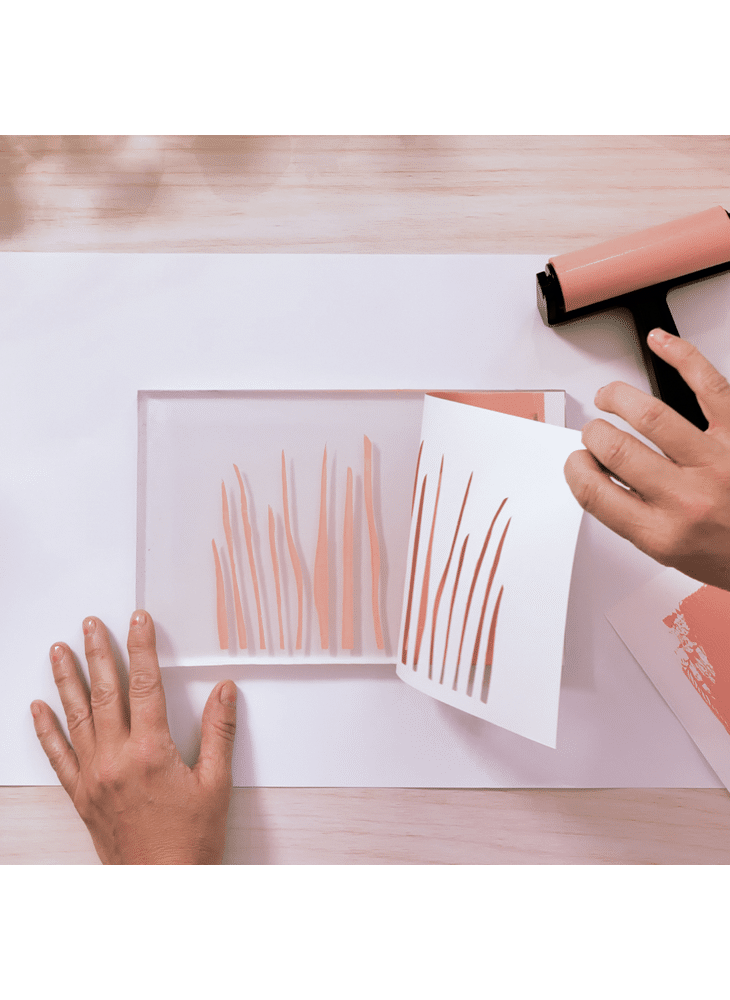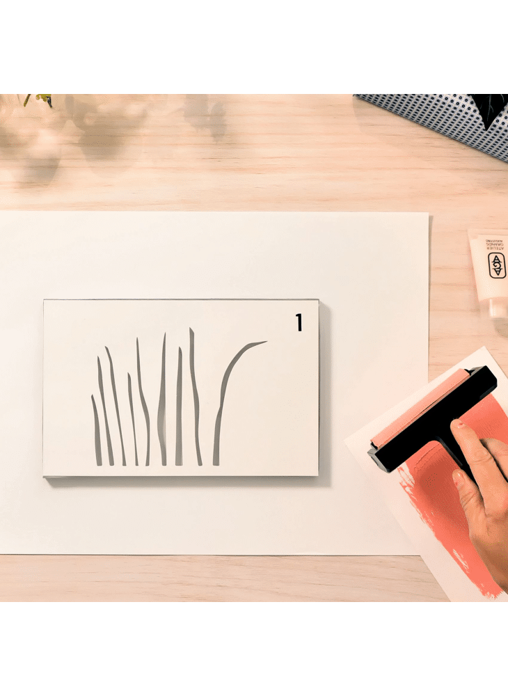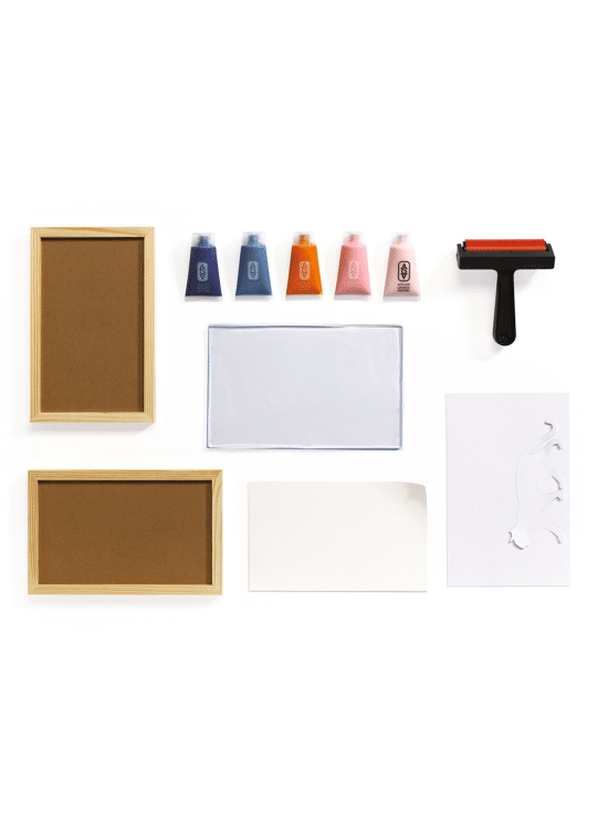 1 siliconen gelplaat (formaat 235 x 150 mm) Een brayerrol 5 tubes verf van 30 ml 10 vellen papier om te bedrukken 4 scheurvaste kunstsjablonen 2 houten lijsten Een folder en een kaart met QR-code waarmee je een instructievideo kunt bekijken om de activiteit te ontdekken
