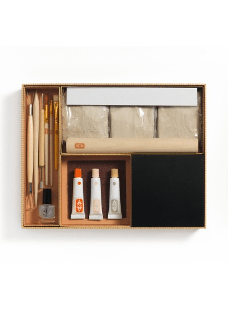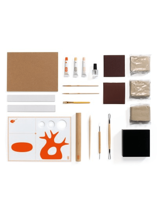 3 x 250 g klei 4 gereedschappen 1 sjabloonplaat om de verhoudingen te helpen bepalen 1 houten werkblad 3 penselen 3 x 10 ml verf 1 x 10 ml lak 1 houten beschilderde presentatiestandaard 1 model om te volgen Een folder en een kaart met QR-code waarmee je een instructievideo kunt bekijken om de activiteit te ontdekken