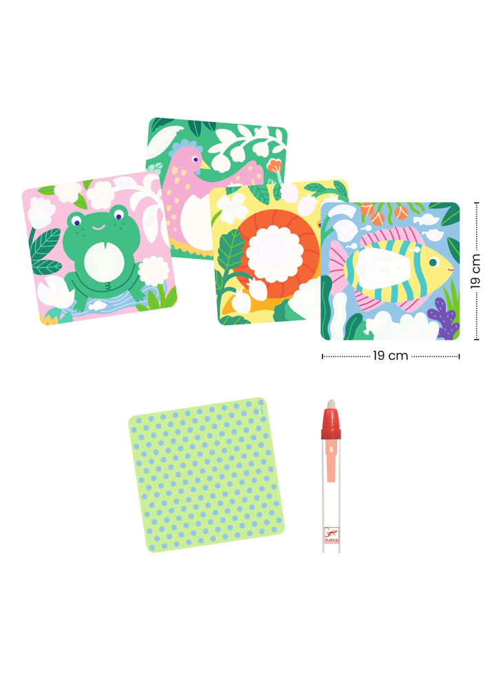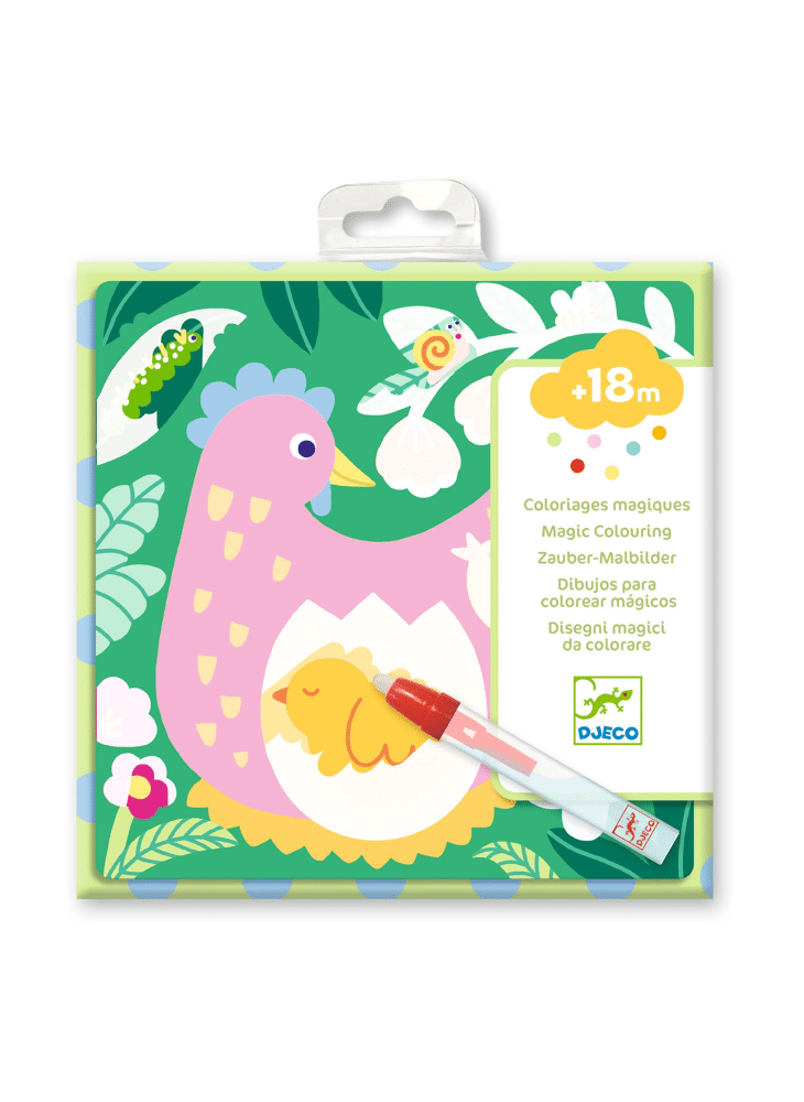 Een kleurboekje op waterbasis geschikt voor kinderen vanaf 18 maanden. Het kind kleurt de witte delen in met de waterpen om te ontdekken wat er achter verborgen zit. Het lijkt wel magie: er verschijnen babydieren! De kleurplaten drogen en het kind kan opnieuw beginnen!