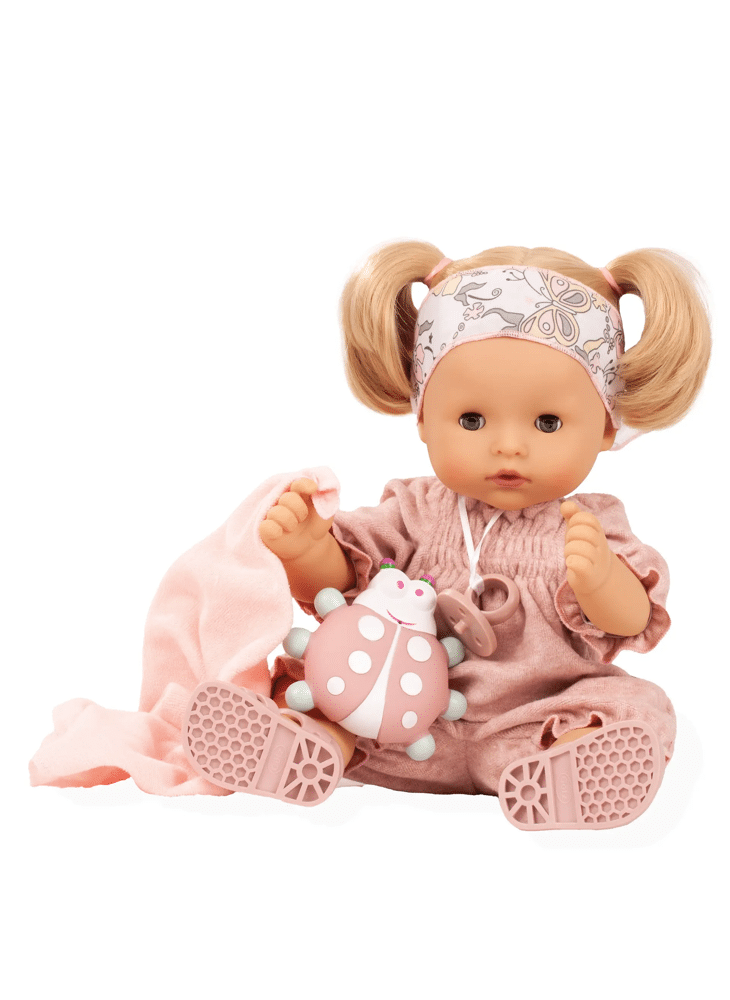 This enchanting Maxy Aquini Butterfly Bathing Doll is the ideal playmate for little water enthusiasts! With her adorable blue sleeping eyes and styleable blonde hair, she invites children to hours of imaginative play. Her summery old-rose terry cloth outfit is perfectly complemented by matching sandals and a cute butterfly-print headband. The included bath towel and ladybug-shaped water toy complete the fun—whether in the bathtub, pool, or at the beach.