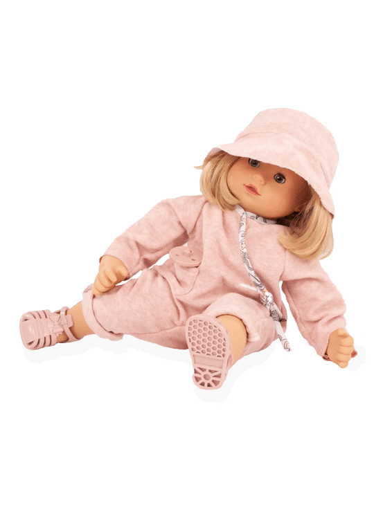 Our Maxy Muffin Butterfly delights with her soft fabric body, loving blue sleeping eyes, and blonde pageboy cut. She is not only a beautiful doll dressed in an old-rose terry suit and summer sandals but also the perfect companion for little doll parents who want to playfully develop their creativity and social skills.