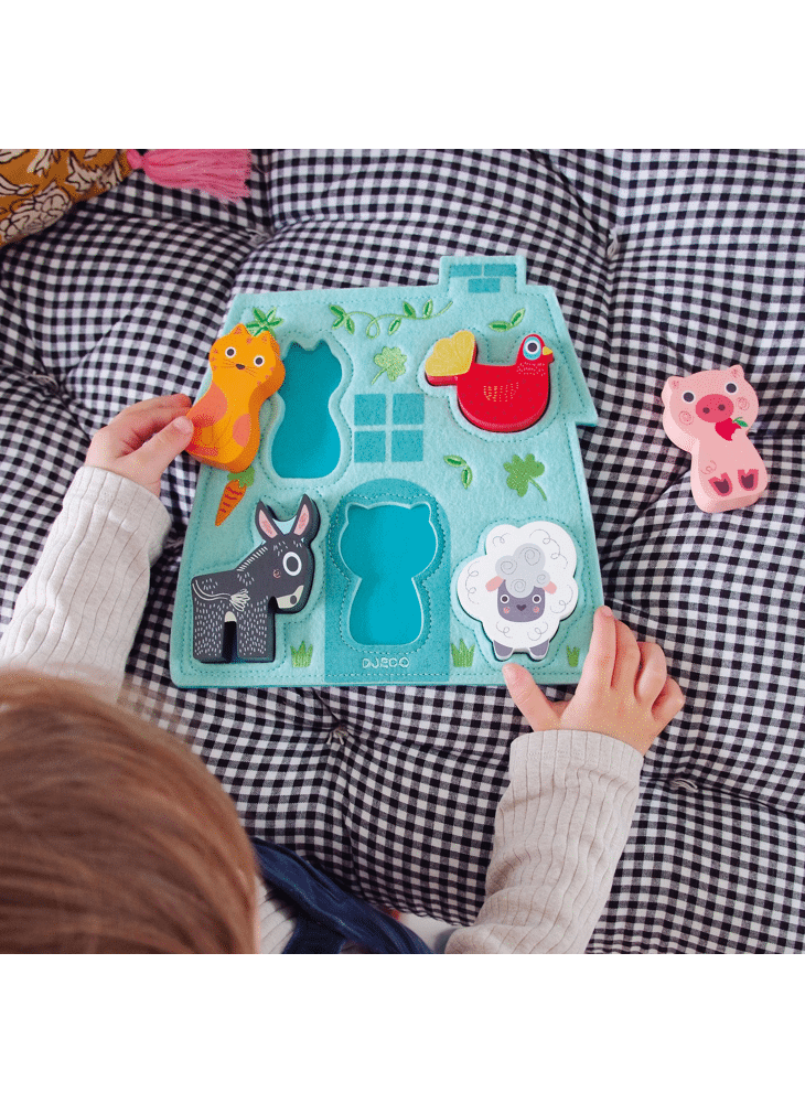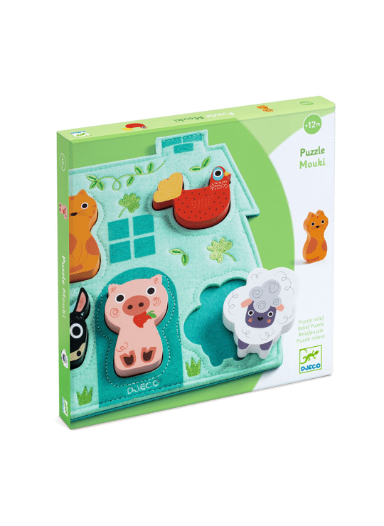 Mouki is een puzzel met het thema de boerderij. Een mooie basis in de vorm van een boerderij van geborduurd en bedrukt vilt en 5 houten dieren om goed te plaatsen.