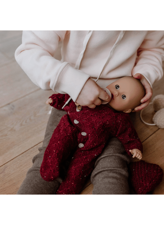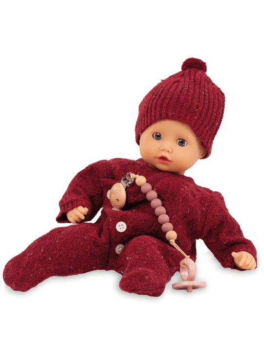 Celebrate the 75th anniversary with the Muffin Baby jubilee – a high-quality doll dressed in an elegant burgundy knit overall with refined buttons and a matching hat. The set is completed with a stylish pacifier chain and pacifier. This limited edition stands out for its exceptional craftsmanship and makes a valuable gift for discerning doll enthusiasts. Quality and design come together here in a truly special way.