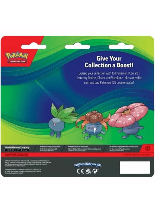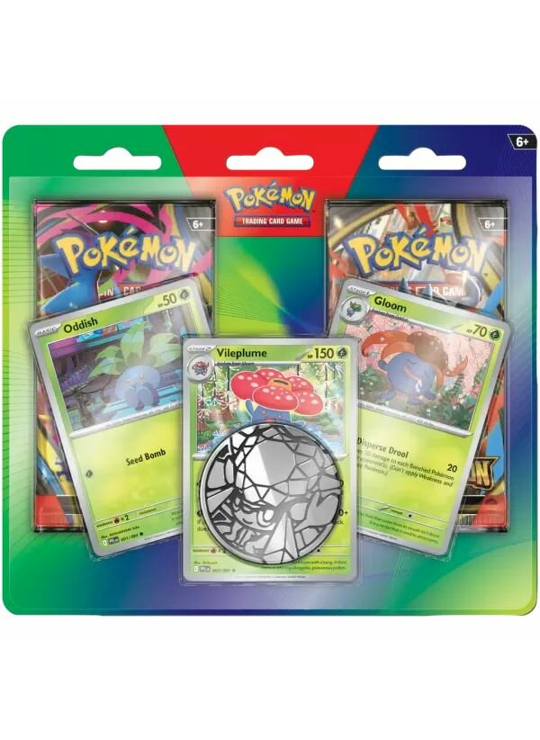 Complete Pokémon booster blister met 2 packs, promo kaarten van Vileplume en een munt – ideaal voor verzamelen en spelen.