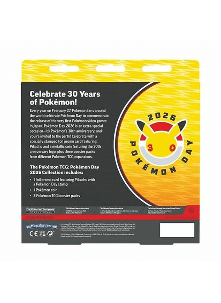 Vier 30 jaar Pokémon met de Pokémon Day 2026 Collection. Deze feestelijke set bevat een glanzende Pikachu-promokaart met exclusieve Pokémon Day-stempel, een metalen jubileummunt en 3 booster packs uit verschillende Pokémon TCG-uitbreidingen. Inclusief codekaarten voor Pokémon TCG Live, zodat je ook digitaal kunt spelen en verzamelen.