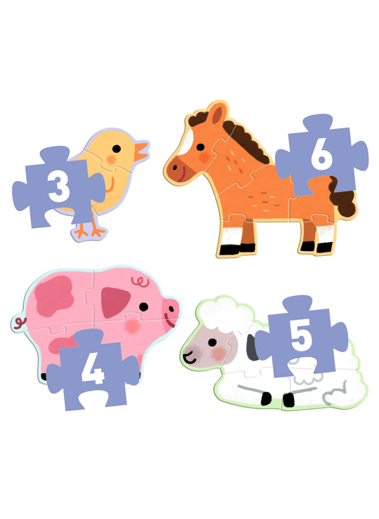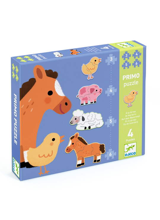 Puzzel Primo ‘Op de boerderij’ bevat 4 evoluerende silhouetpuzzels van oplopende moeilijkheidsgraad over het thema dieren. Deze puzzels zijn speciaal ontworpen voor kinderen vanaf 2 jaar.