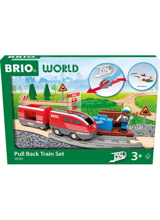 Altijd dolle pret met de 36102 Pull Back Train Set. Hij werkt 100% op de energie die je kleintje hem geeft. Dit treintje heeft geen batterijen nodig en brengt een grote glimlach op kleine gezichten. Trek het rode treintje achteruit en kijk hoe hij zorgeloos over de rails zoeft. Als hij langzamer rijdt, geef je hem meteen weer nieuwe energie en hij zoeft direct weer vrolijk verder. Met makkelijke functies en klassieke BRIO magneten is het een geweldige aanwinst voor de BRIO World van kleine machinisten.