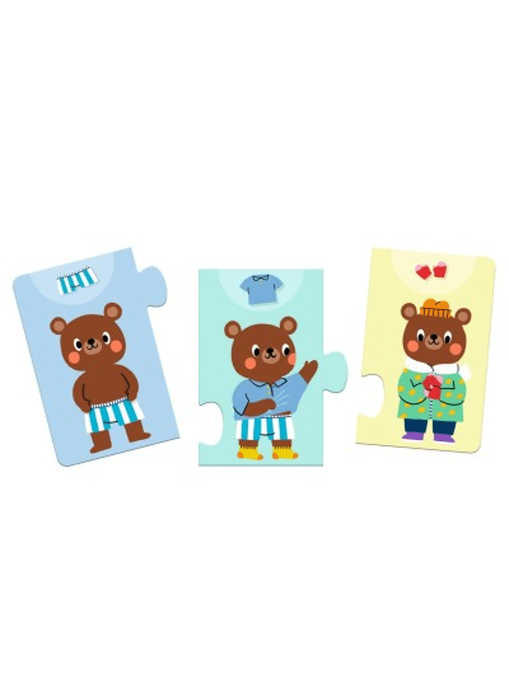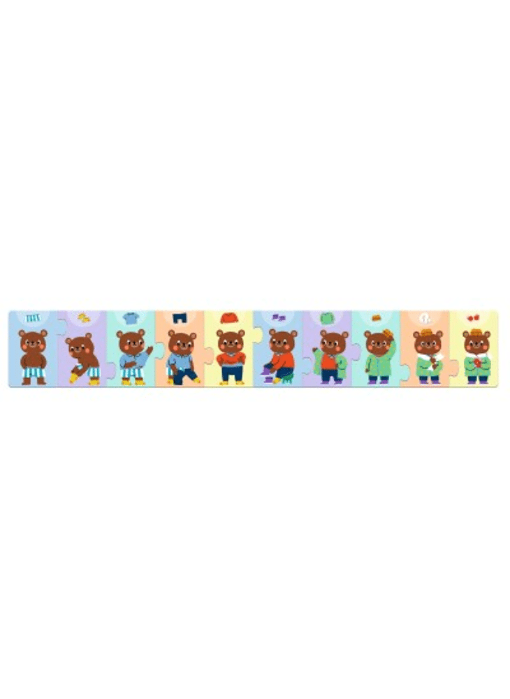 ‘Nounours kleedt zich aan’ is een puzzelverhaal van 10 stukken die in de juiste volgorde gelegd moeten worden om de stappen van aankleden te leren.