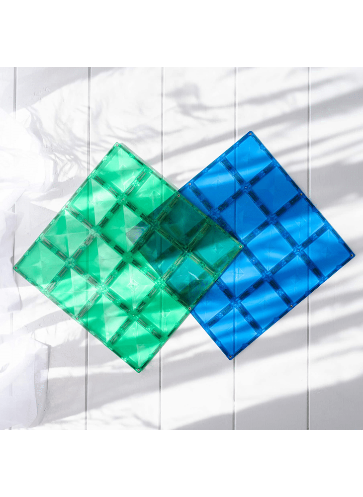 When it comes to magnetic tile play, it’s all about that base! Help children bring to life their inspired ideas and build twice as tall with our 2 piece Base Plate Pack, featuring one blue and one green 30cm x 30cm powerful magnetic building plate!