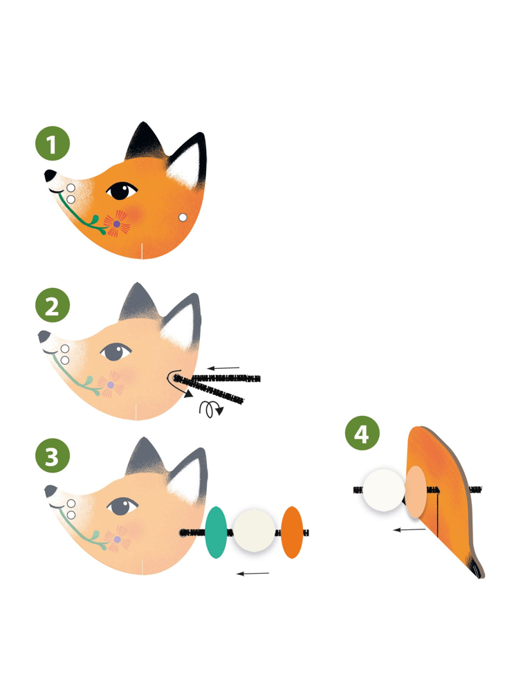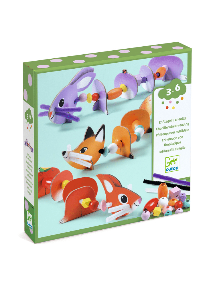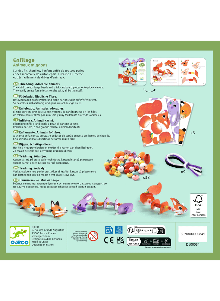 Een originele activiteit om 3 schattige dieren tot leven te brengen! Het kind rijgt houten kralen en voorgesneden elementen van dik karton aan de chenilledraad om zijn eigen modellen te maken. Een activiteit die de creativiteit, fijne motoriek en verbeelding stimuleert, met eindeloze mogelijkheden om de elementen te combineren en je eigen grappige dieren te ontwerpen.