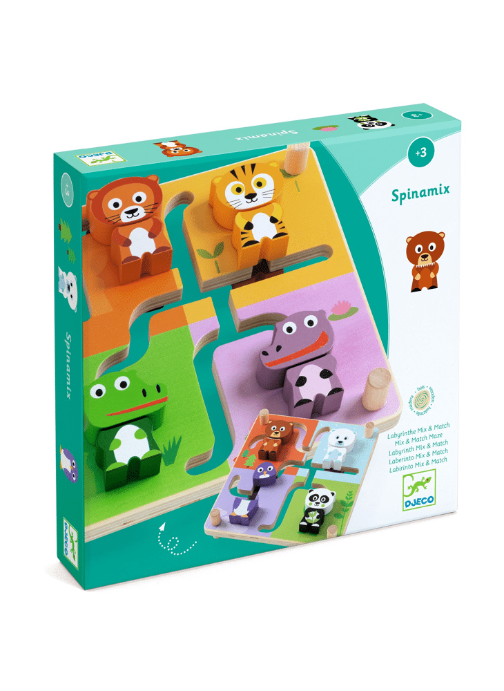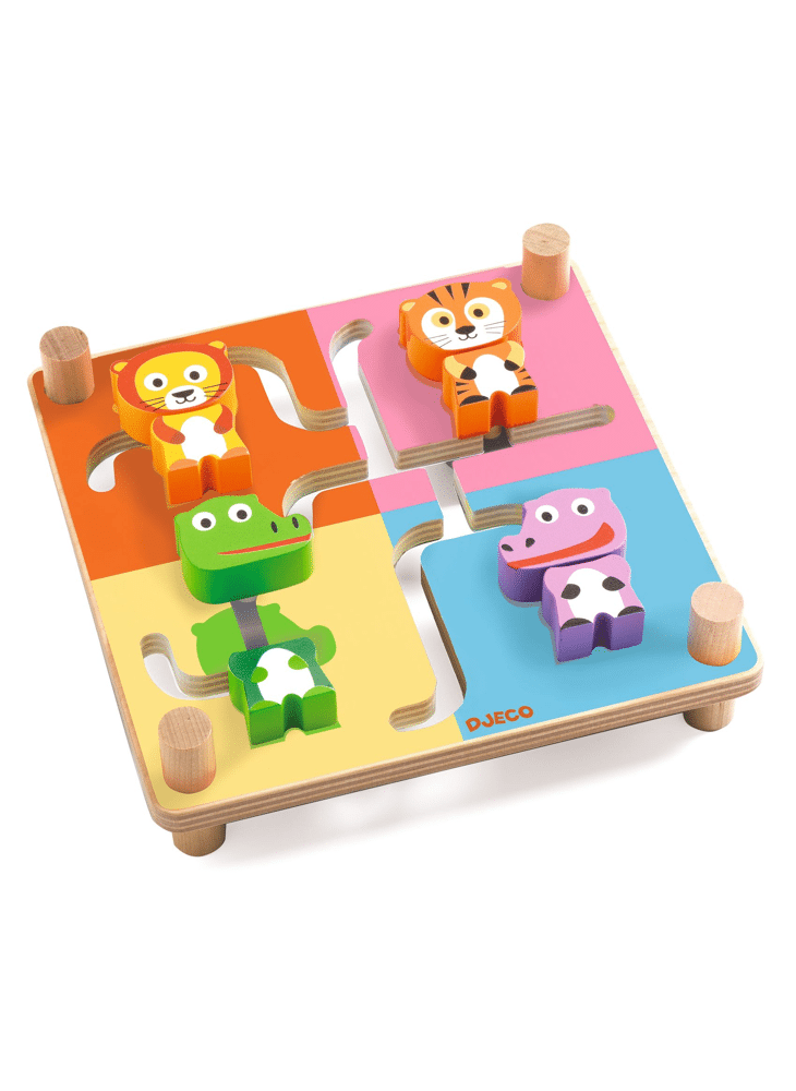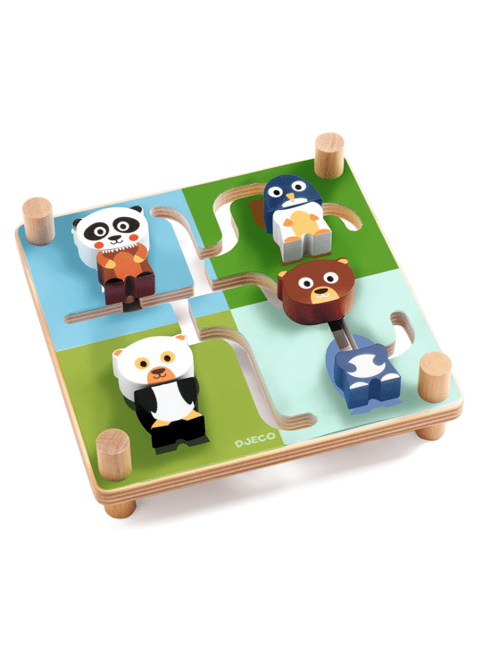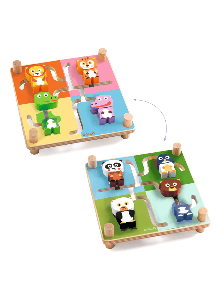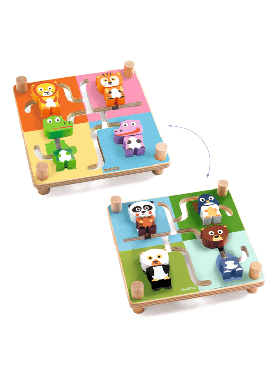 Het kind voegt de twee stukken van elk dier samen in zijn omgeving door de stukken door het doolhof te schuiven. Als de 4 dieren in elkaar zijn gezet, draait het kind het doolhof om, om de andere 4 dieren op de achterkant samen te voegen.