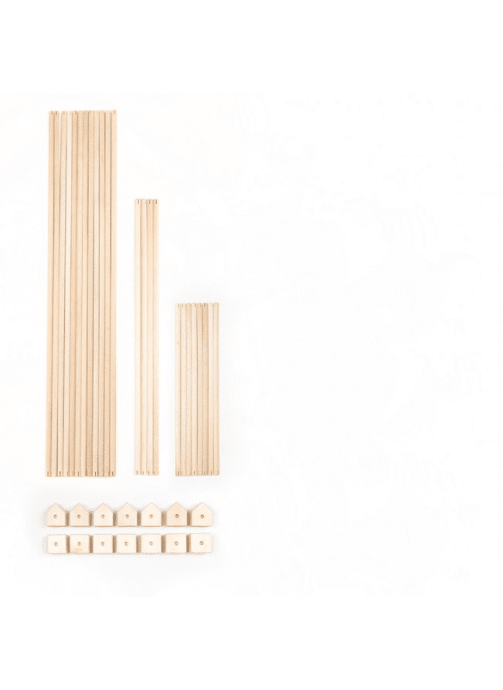 7 kubusvormige blokken van 6 x 6 x 6 cm, 7 vijfhoekige blokken van 6 x 6 x 7,5 cm, 12 stokjes, 80 cm lang, 4 stokjes, 56 cm lang, 8 stokjes, 39 cm lang, 2 stukken stof van 84 x 69 cm, 1 stuk stof van 60 x 75 cm kreema (naturel grijswitte kleur), 1 stuk stof van 83 x 49 cm kreema (naturel grijswitte kleur), 1 stuk stof van 43 x 75 cm kreema (naturel grijswitte kleur), 1 stuk stof van 83 x 33 cm kreema (naturel grijswitte kleur)
