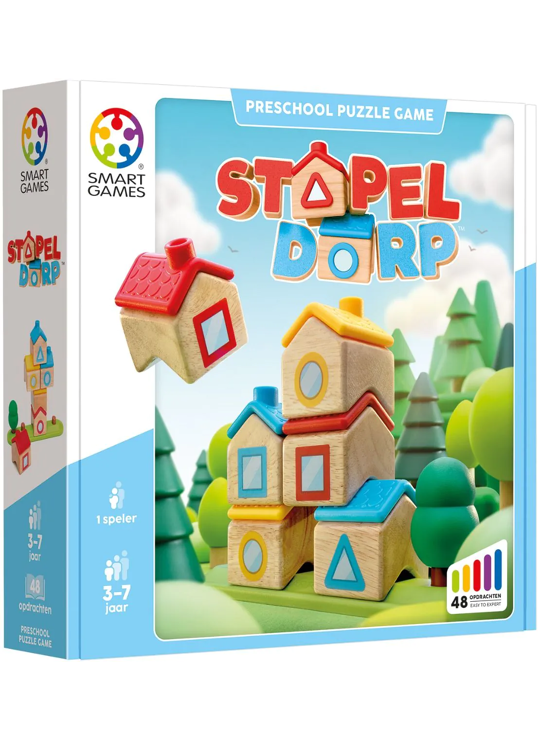 Welkom bij Stapel Dorp! Bouw huisjes van onder naar boven in 48 uitdagingen met de kleurrijke houten blokken. Ontwikkel logisch denken, ruimtelijk inzicht en fijne motoriek met deze slimme puzzels. Kijk goed naar de ramen en schoorstenen... en stapel slim!