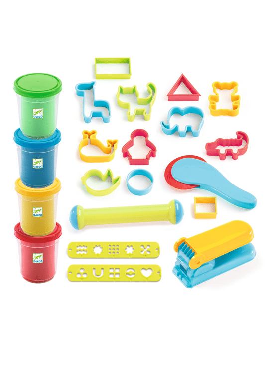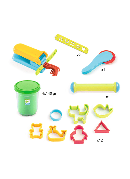 Een eerste complete set boetseerklei voor kinderen vanaf 18 maanden. 17 accessoires en 4 potjes ultrazachte, geurige boetseerklei om in alle vrijheid mee te spelen en te creëren.