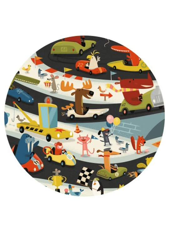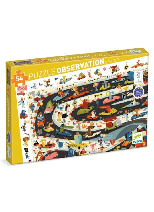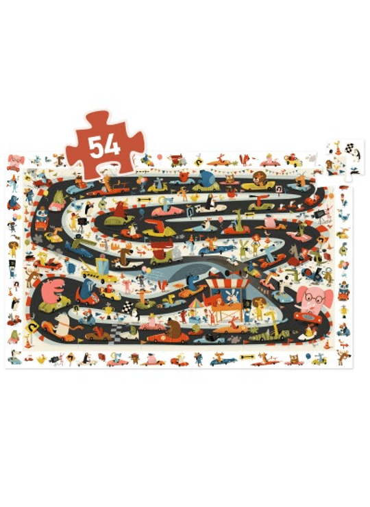 Een 54-delige observatiepuzzel met als thema de autosport. Op je plaatsen, klaar, af! Wie zal de grote winnaar zijn? Het kind maakt een puzzel en amuseert zich dan met het zoeken naar de onderdelen van de fries in de afbeelding.